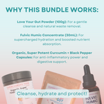 How do these products work together? Diatomaceous Earth cleanses, Fulvic Humic Concentrate optimises absorption, and Curcumin Capsules support gut healing and inflammation reduction—creating a comprehensive detox system.