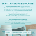 How does this bundle support cholesterol health? The bundle combines ingredients that work synergistically to manage cholesterol. Vegan Protein + Fibre provides cholesterol-lowering soluble fibre, Diatomaceous Earth detoxifies the digestive tract, and Organic Tasmanian Seaweed delivers essential nutrients to support healthy lipid levels.