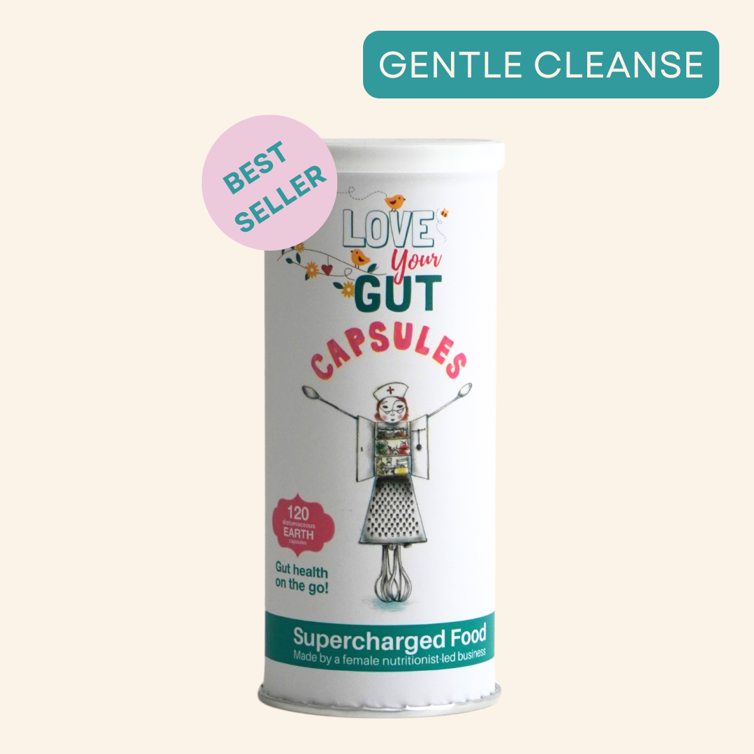 Supercharged Foods Love Your Gut Capsules – vegan capsules with food-grade, organic diatomaceous earth (fossil shell flour) for gentle gut cleanse, digestive health, toxin and waste removal, anti-bloating, improved nutrient absorption, and microbiome support; rich in silica and essential minerals