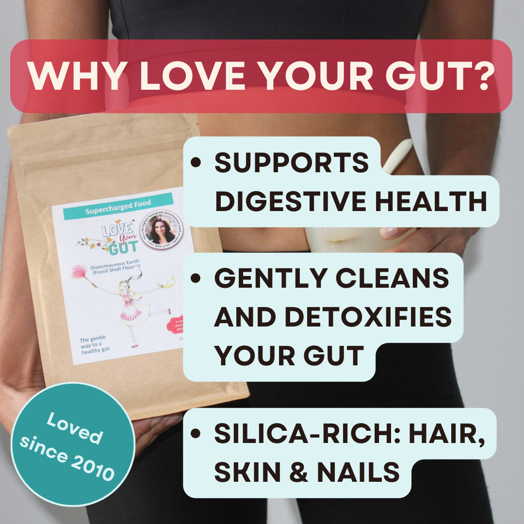 Love Your Gut Diatomaceous Earth (DE) powder gently cleans the accumulated build-up of waste, toxins, metals and mucous in the digestive tract. Use every day to help keep your gut clean, toned and functioning at its peak. DE is a superfine, tasteless, all natural mineral powder.