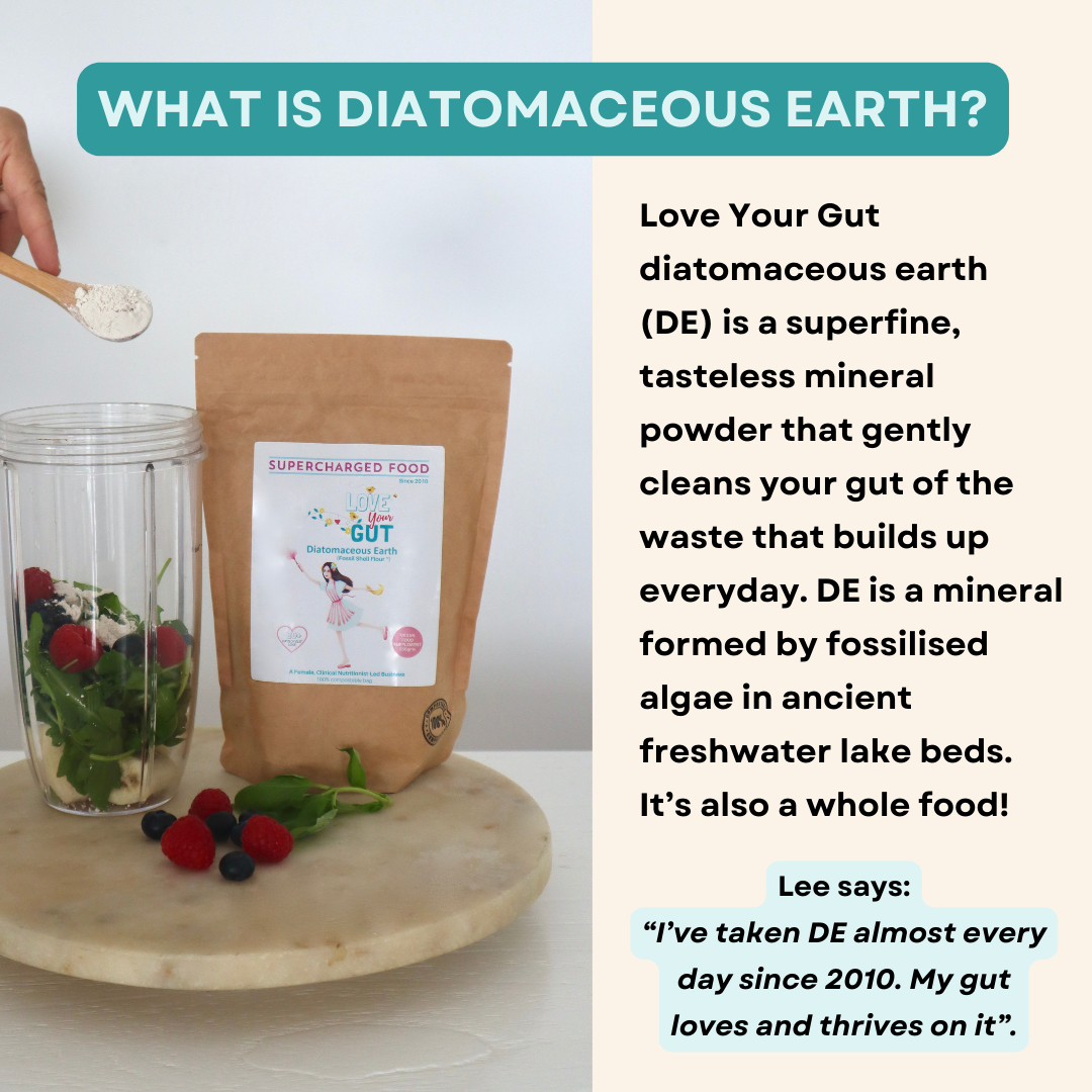 Lee says: “I’ve taken diatomaceous earth almost every day and prescribed DE in my clinic since 2010. Gut health starts with a clean gut. We can carry around 500g to 3 kilos of undiscarded waste in our digestive system. It affects how our gut absorbs nutrients and discards waste. A clean gut will help whatever your health condition. That gentle clean is the role of my Love Your Gut diatomaceous earth”