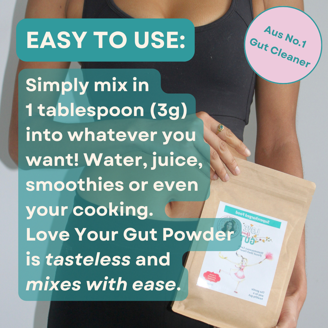 Supercharged Food's Love Your Gut Powder – food grade Australian diatomaceous earth supplement for gut health, gentle digestive cleanse, toxin and waste removal, improved nutrient absorption, reduced bloating, and microbiome support.