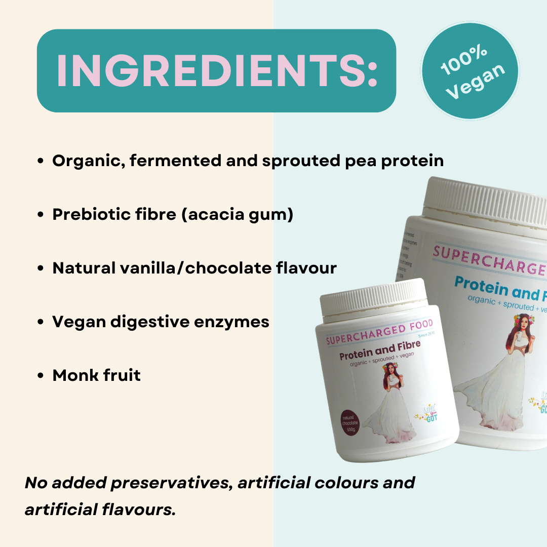 Gut-loving vegan protein and fibre supplement – organic, sprouted and fermented pea protein with prebiotic fibre, digestive enzymes, and natural vanilla or chocolate flavour; supports gut health, digestion, microbiome balance, energy, and nutrient absorption, developed by clinical nutritionist Lee Holmes.