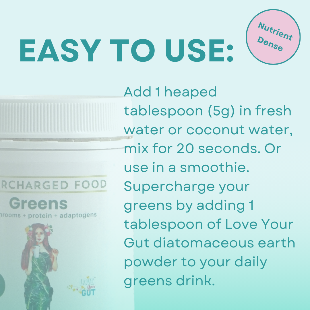 Serving suggestion: Supercharge your greens by adding 1 tablespoon of Love Your Gut diatomaceous earth powder to your daily greens drink.