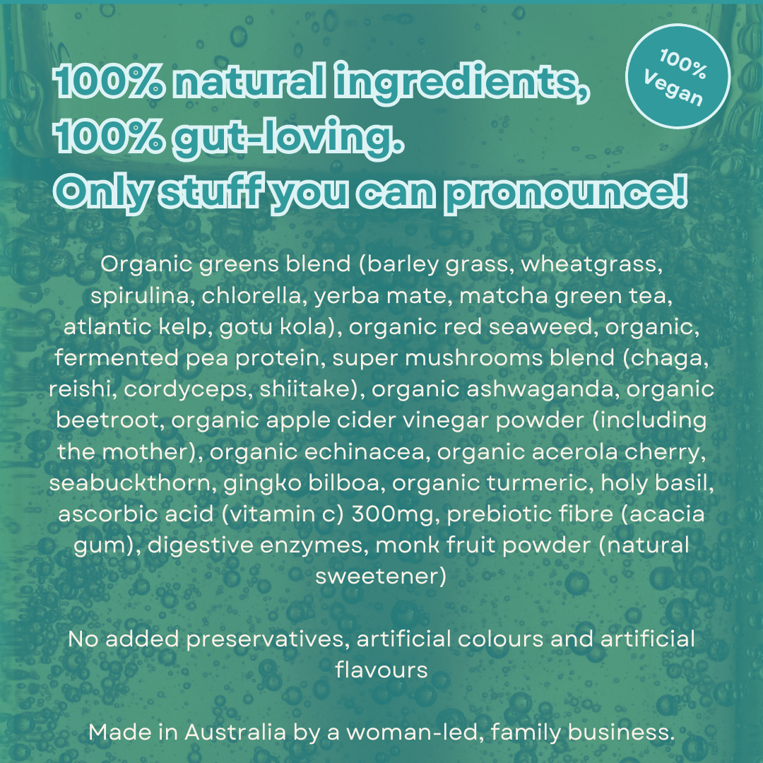 Organic greens blend (barley grass, wheatgrass, spirulina, chlorella, yerba mate, matcha green tea, atlantic kelp, gotu kola), organic red seaweed, organic, fermented pea protein, super mushrooms blend (chaga, reishi, cordyceps, shiitake), organic ashwaganda, organic beetroot, organic apple cider vinegar powder (including the mother), organic echinacea, organic acerola cherry, seabuckthorn, gingko bilboa, organic turmeric, holy basil, ascorbic acid (vitamin c) 300mg, prebiotic fibre (acacia gum), digestive enzymes, monk fruit powder (natural sweetener)